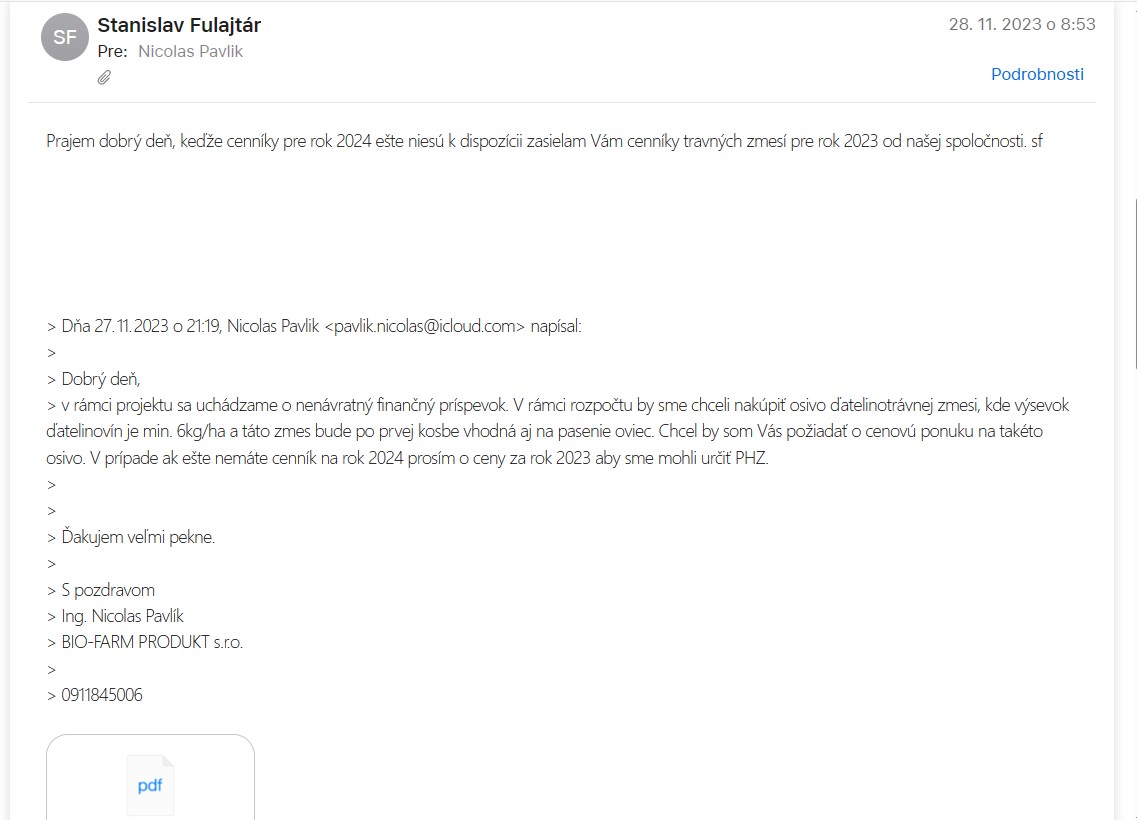 Osivo ďatelino-trávnej miešanky s pomerom ďatelinovín min. 25% resp. výsevkom min. 6kg/ha. Výsev celej zmesi 30kg/ha pričom sa bude vysievať cca 20ha určených na testovanie.
