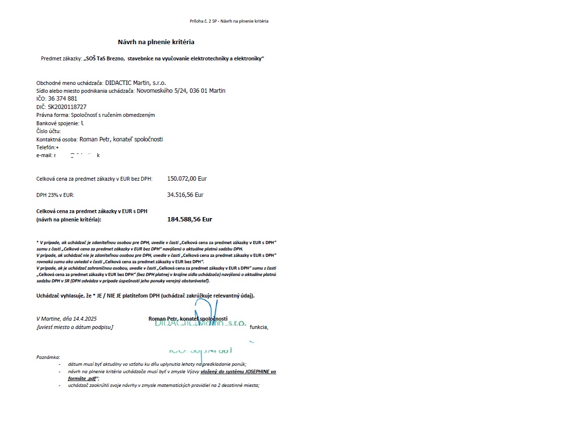 Predmetom zákazky je dodanie, inštalácia/montáž a zaškolenie stavebnice na vyučovanie elektrotechniky a elektroniky a e-učebníc. Podrobný rozpis položiek s parametrami zariadení a techniky tvorí samostatnú prílohu.