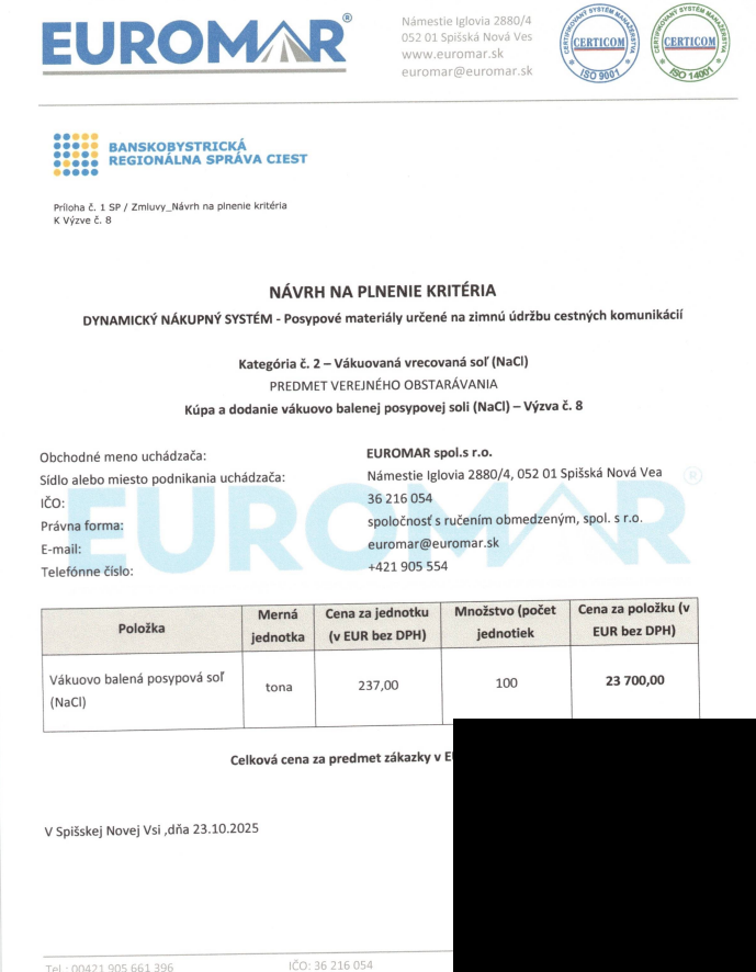 Kúpna zmluva "Chemický posypový materiál používaný na posyp v rámci zimnej údržby cestných komunikácií - Kúpa a dodanie vákuovo balenej posypovej soli (NaCl) na výrobu soľanky pre zimnú sezónu 2025/2026