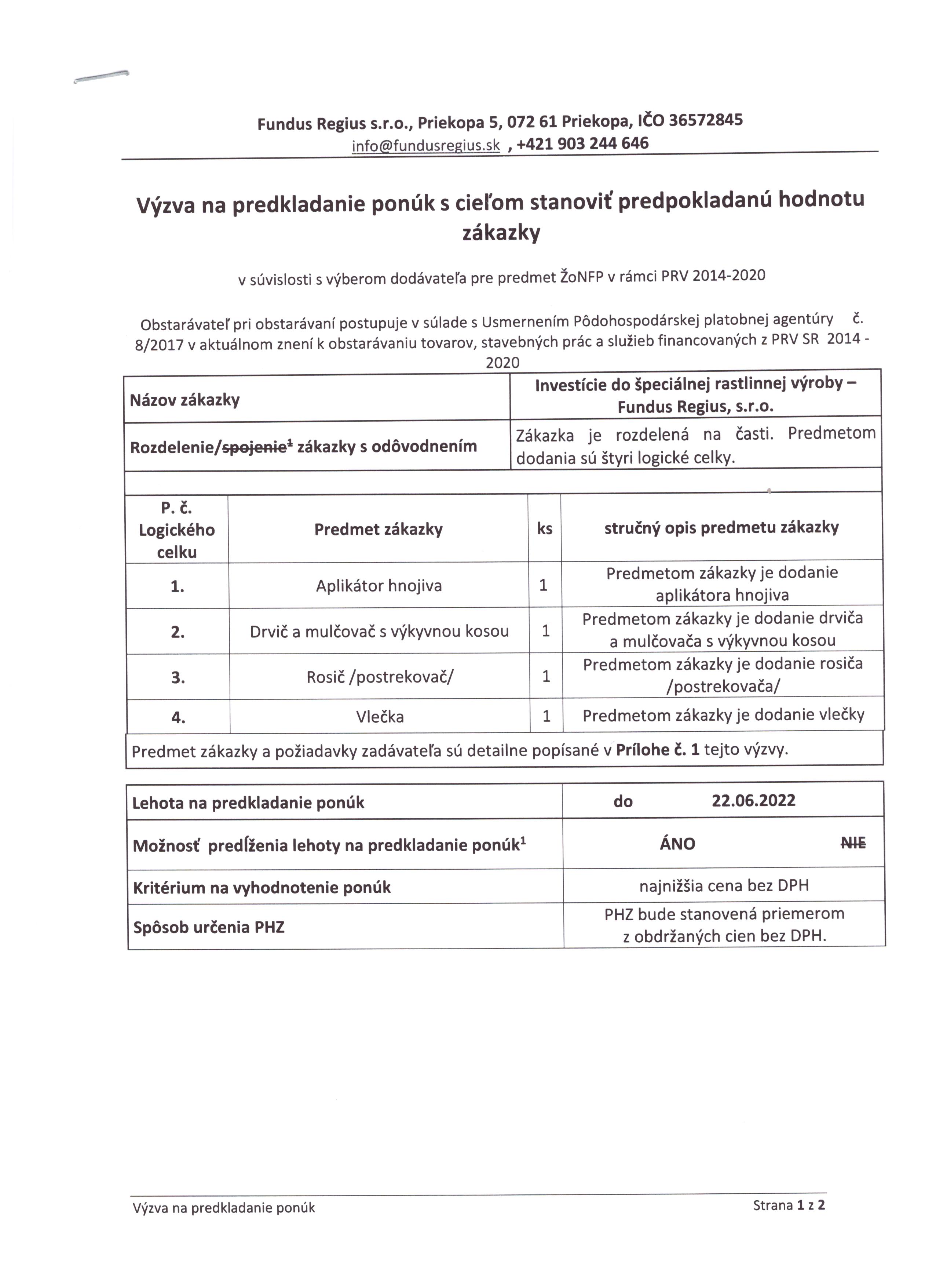 Investície do špeciálnej rastlinnej výroby – Fundus Regius, s.r.o.