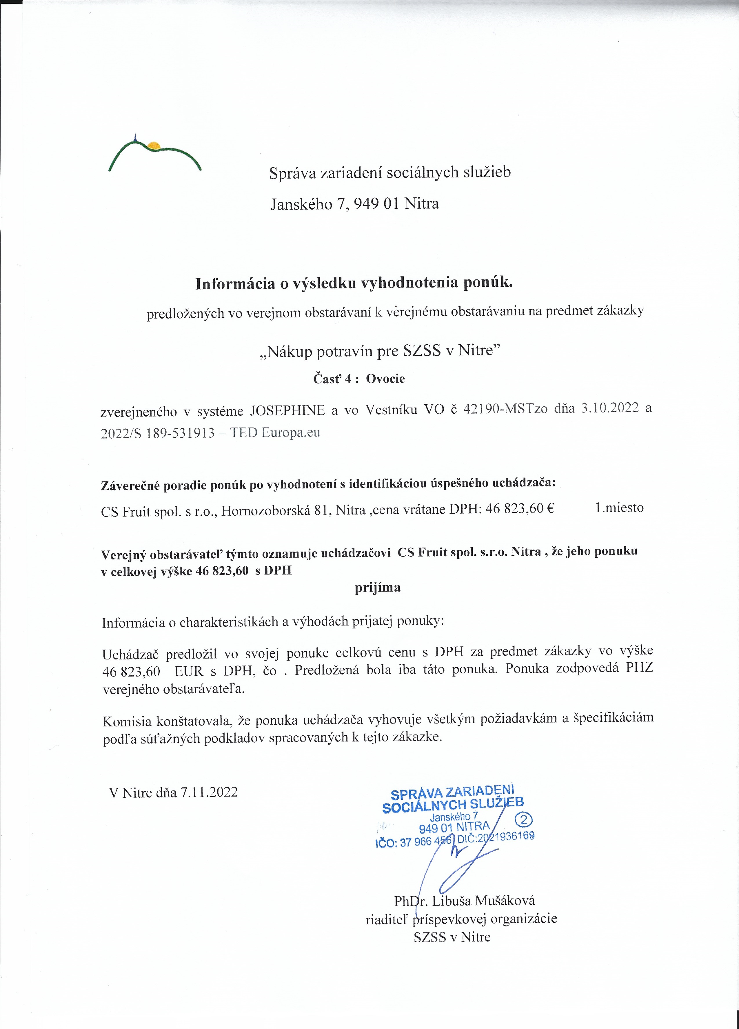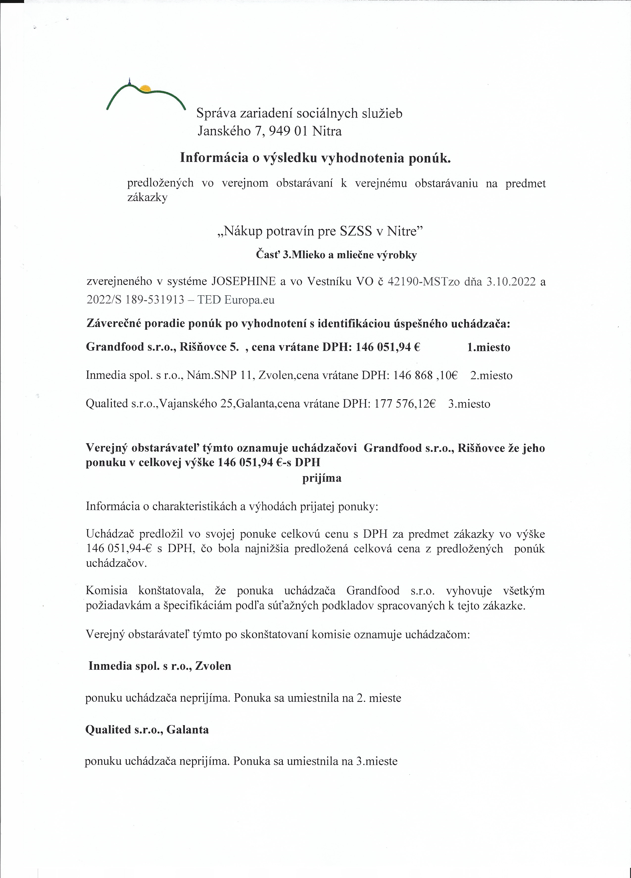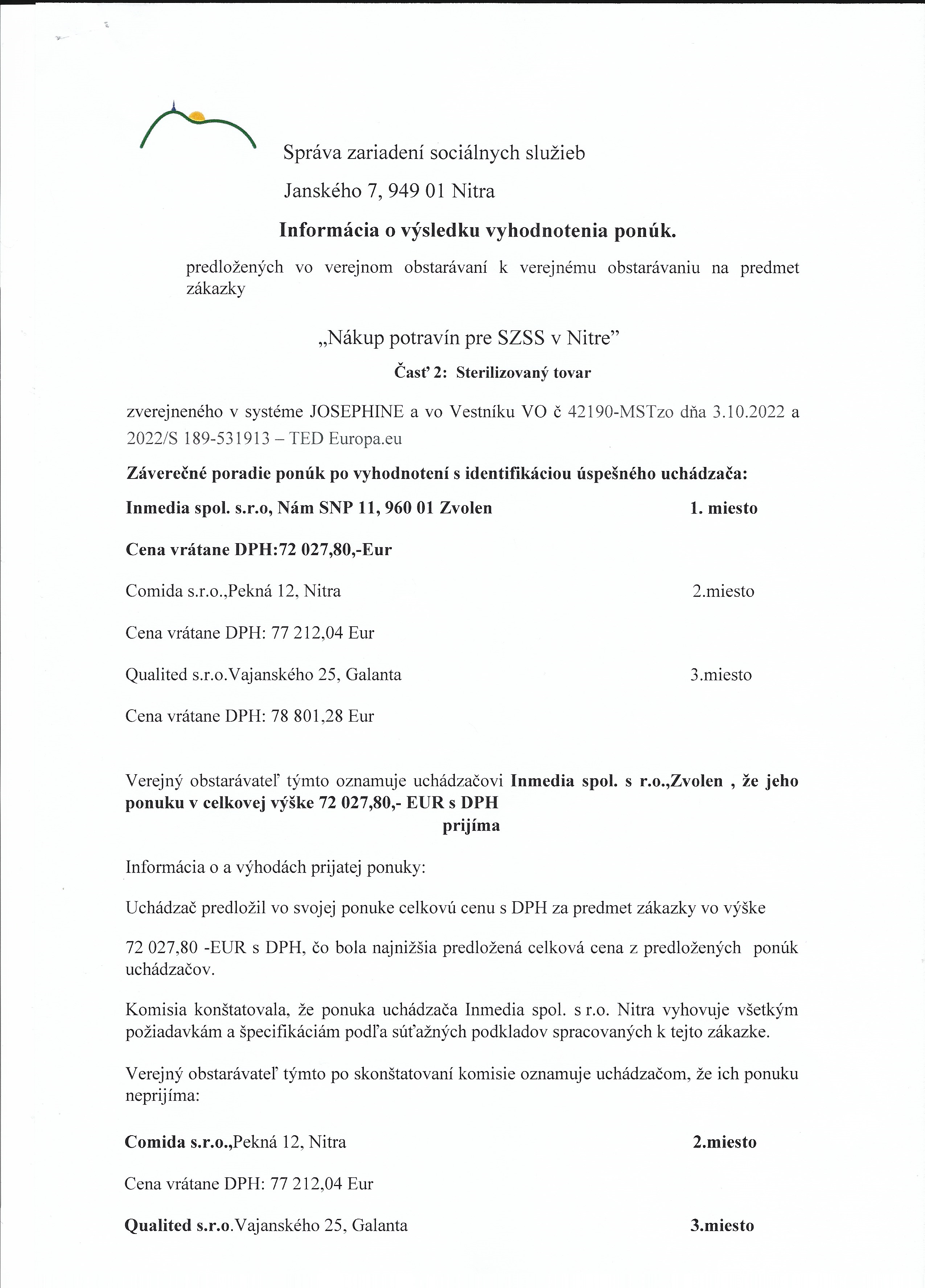 Informácia o výsledku vyhodnotenia ponúk