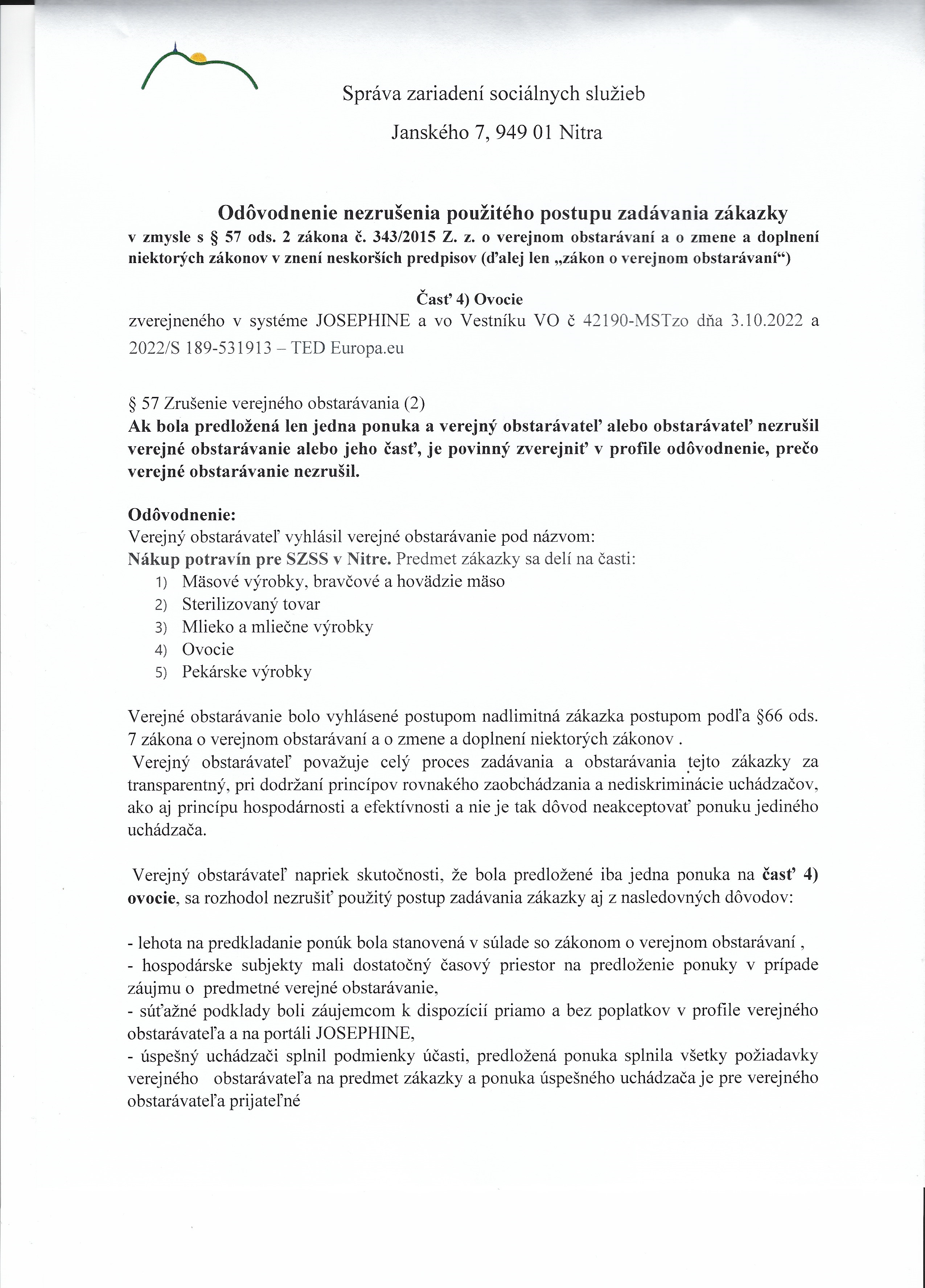 Nákup potravín pre SZSS v Nitre. Predmet zákazky sa delí na časti: