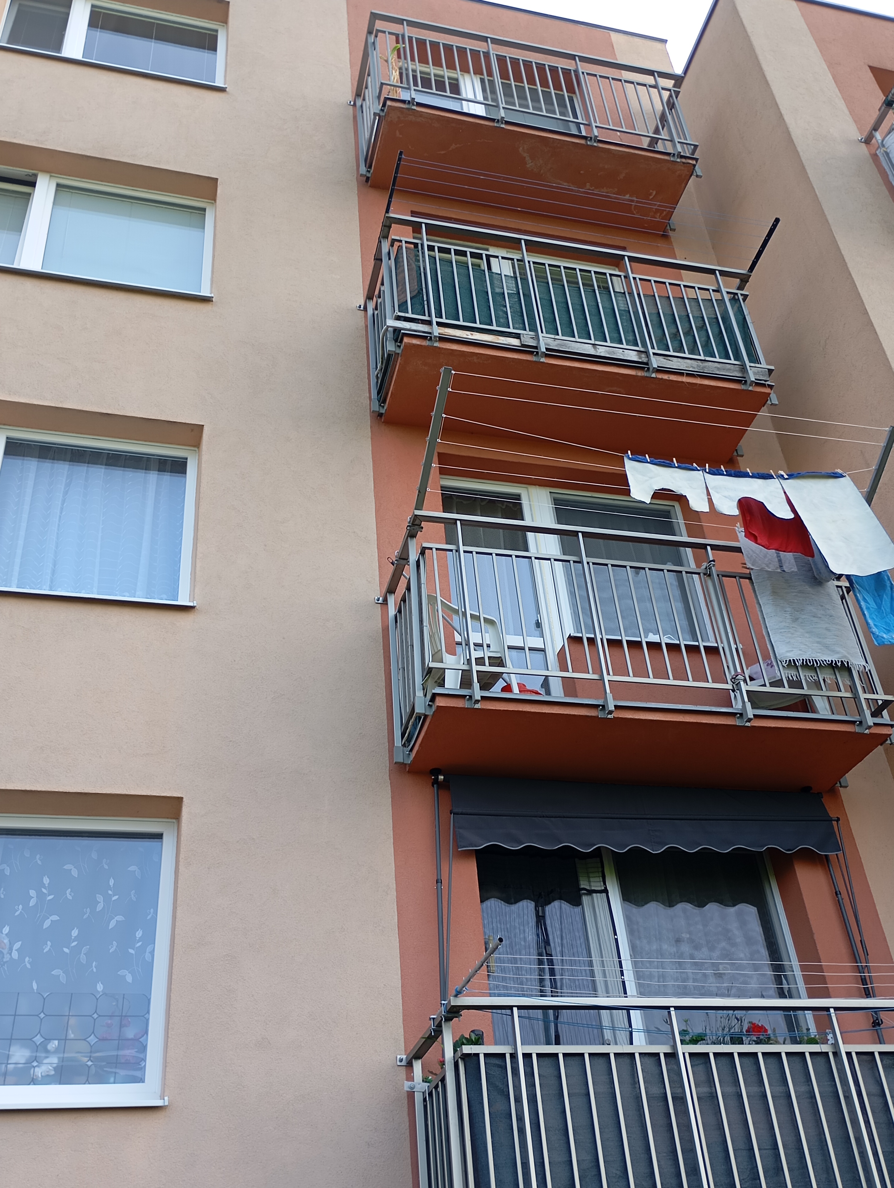 Jedná se o opravu izolace balkonů v jednotlivých bytech dle seznamu, který je nedílnou součástí dokumentace. Demontáž + zpětná montáž zábradlí, strhnutí stávající fasádní omítky s výstužní tkaninou – spodní část balkonu, demontáž keramické dlažby, vytvoření nové hydroizolace – PVC folie, provedení spádové vrstvy, olištování balkonu systémovými lištami. Položení nové betonové dlažby na plastové terče, ukončení hydroizolace na fasádě pogumovanou lištou. Penetrační vrstva, montáž výstužné sítě do stěrkového tmelu - 2 vrstvy, penetrace, natažení silikátové omítky a následné zapravení. Jedná se celkem o 48 ks balkonů. Položkový rozpočet je sestaven na opravu 1 ks balkonu.