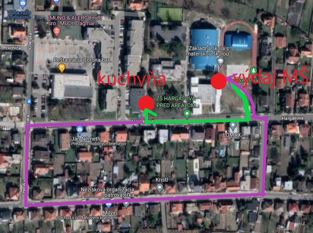 Mapa - vzdialenosť kuchyne ZŠ a jedálne MŠ