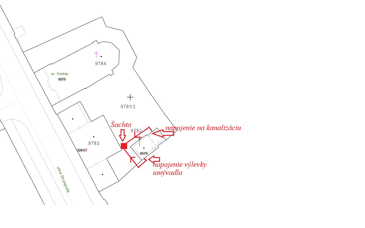 • ide o napojenie sa na jestvujúci kanalizačný vnútro areálový rozvod Gréckokatolíckej cirkvi, ktorý sa nachádza v parkovisku za budovou Gréckokatolíckej cirkvi v areáli Ondrejského cintorína na ul. 29. Augusta v Bratislave. Dovedenie nového kanalizačného potrubia do existujúcej šachty, z ktorej sa zrealizuje nové napojenie 1 objektu – správcovského domčeka (WC - odpadová rúra Ø100mm, Drez kuchynskej linky odpad Ø 50mm + vonkajšie umývadlo na čelnej fasáde odpadová rúra Ø 50mm);